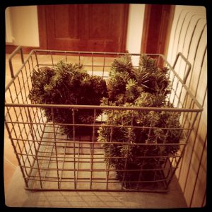 La otra la tengo en salón a modo de adorno de suelo he usado como maceta el cesto cuadrado de hierro gris antiguo grande(misma operación que la anterior, platito debajo de la maceta original para que el agua no manche) y como el cesto era grande lo he adornado con bolas de árbol de navidad y he conseguido un centro, en mi caso para el suelo, de lo más navideño.